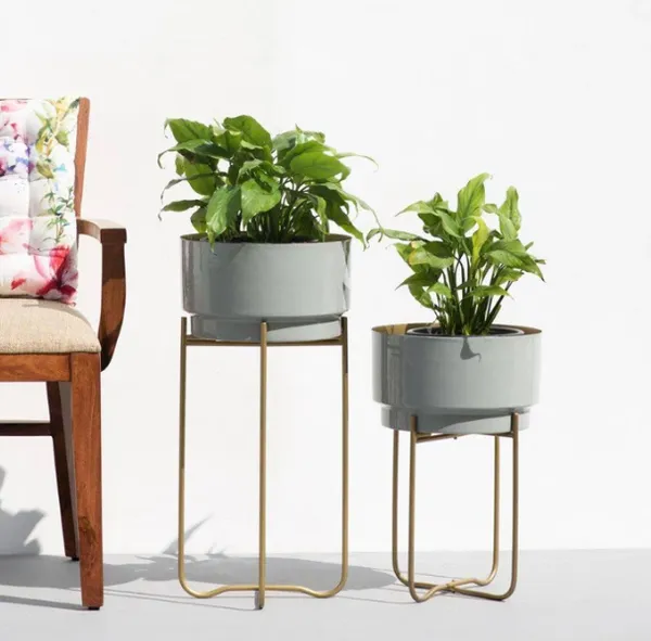 Set Of 2 Grey And Gold Rust Iron Pot With Stand | For Indoor Gardening